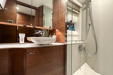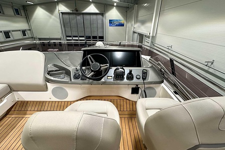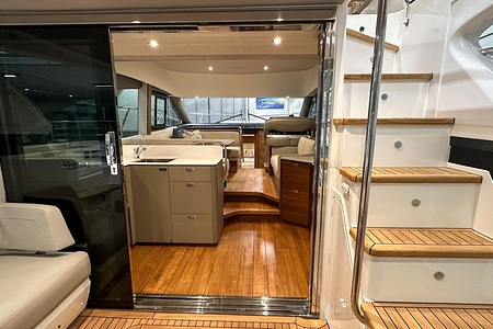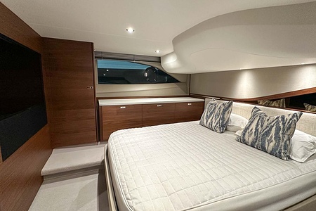 The bright and airy saloon, generous galley, and seamless indoor-outdoor layout make her ideal for both short getaways and extended cruising. Two beautifully appointed cabins, each with its own bathroom access, offer excellent accommodation for family and guests. On the flybridge, you’ll find a superb social area with seating, sunbathing space, and everything needed for entertaining.